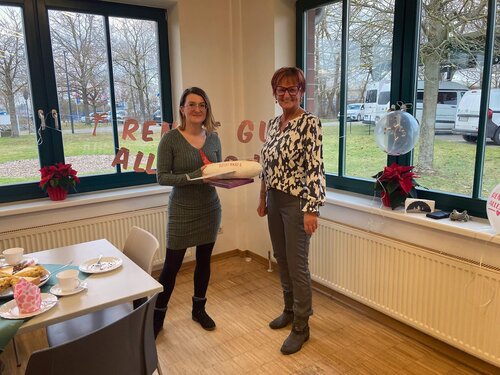 Mit ihrer herzlichen, empathischen und fleißigen Art war Frau Götze bei Kolleginnen, Kollegen und Beschäftigten gleichermaßen geschätzt. Fachbereichsleiter Herr Hrybinski sowie Bereichsgeschäftsführerin Frau Peters fanden in ihren Ansprachen wertschätzende Worte und brachten ihr Bedauern über den Abschied zum Ausdruck. Als kleine Überraschung sammelten die Kolleginnen und Kollegen für die reisebegeisterte Frau Götze ein Reisetaschengeld.