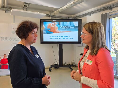 Der erste Tag begann diesmal jedoch mit einem Besuch des neuen Schulungszentrums an der Gesundheits- und Pflegeschule der Wirtschaftsakademie Nord. Geschäftsführer Dr. Olaf Martin begrüßte alle Anwesenden und lud anschließend dazu ein, die neu eingerichteten und technisch gut ausgestatteten Räumlichkeiten zu besichtigen und bei der Gelegenheit auch die verschiedenen Schulungsschwerpunkte auszuprobieren. Angeleitet wurden die Teilnehmenden hierbei durch die Lehrkräfte der Schule. Von Reanimation und Notfallmedizin, über Wundmanagement, bis hin zu dem Testen eines Alterssimulationsanzugs war das Mitmachangebot vielfältig. Wir erhielten so einen Eindruck davon, was unsere Auszubildenden innerhalb der Schulturnusse vermittelt bekommen und welche Fortbildungsthemen die Wirtschaftsakademie auch für unsere Bestandsmitarbeitenden anbieten könnte.