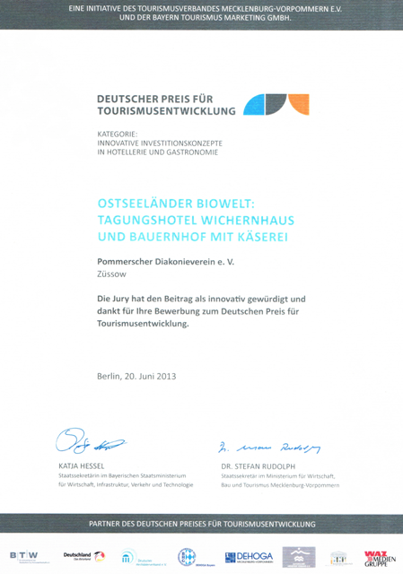 Auf der diesjährigen ITB in Berlin wurde, durch die Tourismusverbände Bayern und Mecklenburg-Vorpommern initiiert, erstmalig bundesweit der „Deutsche Preis für Tourismusentwicklung“ ausgelobt. Auf den in zwei Kategorien zu vergebenen Preis hatten wir uns mit der Ostseeländer Biowelt: BIOTagungshotel Wichernhaus und Bauernhof mit Käserei in der Preiskategorie „Innovative Investitionskonzepte in Hotellerie und Gastronomie“ beworben. Wichtige Kriterien waren dabei Alleinstellungsmerkmal, Zielgruppenorientierung sowie Vernetzungs- und Kooperationsansätze.