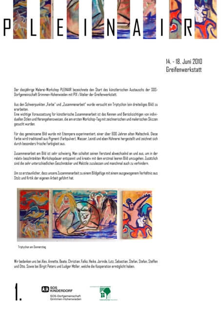 Der diesjährige Malerei-Workshop PLEINAIR bezeichnete den Start des künstlerischen Austauschs der SOS-Dorfgemeinschaft Grimmen-Hohenwieden mit PIX /Atelier der Greifenwerkstatt. Aus den Schwerpunkten „Farbe“ und „Zusammenarbeit“ wurde versucht ein Triptychon (ein dreiteiliges Bild) zu erarbeiten. Eine wichtige Voraussetzung für künstlerische Zusammenarbeit ist das Kennen und Berücksichtigen von individuellen Stilen und Herangehensweisen, die am ersten Workshop-Tag mit zeichnerischen und malerischen Skizzen gesucht wurden. Für das gemeinsame Bild wurde mit Eitempera experimentiert, einer über 600 Jahre alten Maltechnik. Diese Farbe wird traditionell aus Pigment (Farbpulver), Wasser, Leinöl und eben Hühnerei hergestellt und zeichnet sich durch besonders frische Farbigkeit aus. Zusammenarbeit am Bild ist sehr schwierig. Man schaltet seinen Verstand abwechselnd an und aus, um in der relativ beschränkten Workshopdauer entspannt und kreativ mit dem erstmal leeren Bild umzugehen. Zusätzlich sind die sehr unterschiedlichen Geschmäcker und Malstile zuzulassen und manchmal auch zu verhindern. Um so erstaunlicher, dass unsere Zusammenarbeit zu einem Bildgefüge mit einem ausgewogenem Verhältnis aus Stolz und Kritik zur eigenen Arbeit geführt hat.