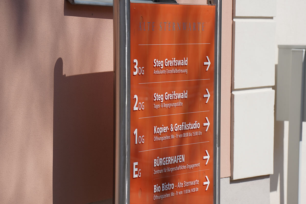 Vor zehn Jahren wurde die Alte Sternwarte in der Greifswalder Martin-Luther-Straße neu belebt. Nach umfangreichen Restaurierungen und Neubau eröffnete der Pommersche Diakonieverein e. V. das Gebäude mit neuen Angeboten aus seinem umfangreichen Leistungsangebot. Der Bürgerhafen, die Medienfabrik (früher Kopier- & Grafikstudio) sowie die Tagesstätte Steg fanden hier ein neues Zuhause. Ganz neu seitdem, als Spezialist für schmackhaften vegetarischen Bio-Mittagstisch vor Ort, das Bio-Bistro Alte Sternwarte.