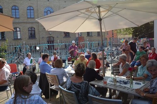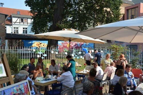 Im Hof des „Vier-Sterne-Hauses“ – neben Steg und Bürgerhafen befinden sich dort auch das Bio Bistro und das Kopier- und Grafikstudio – konnten die Gäste an einem der letzten heißen Sommertage Leckereien, Kultur und vor allem Begegnungen und Austausch genießen. Zahlreich waren die Besucherinnen und Besucher der Einladung gefolgt und konnten im liebevoll dekorierten Außenbereich der Alten Sternwarte zusammensitzen. Ausgestellte Kunstwerke, ein Büchertisch, akustische Untermalung durch die Musizierwerkstatt und ein buntes Buffet inklusive Waffelbäckerei und Grill rundeten den Nachmittag ab.