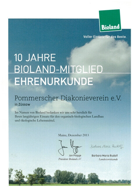 In 2013 jährte unsere Mitgliedschaft im Bioland e. V. zum zehnten Mal. Jetzt haben wir unsere Ehrenurkunde in Empfang genommen.