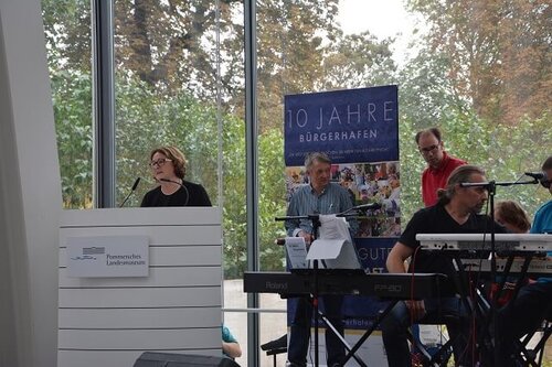 Zu den Gratulanten gehörten auch die Wegbereiter und Begleiter des Bürgerhafens, wie die Landesregierung M-V (vertreten durch den Staatssekretär Herrn Voss), den Landkreis Vorpommern-Greifswald (vertreten durch den Sozialdezernenten Herrn Scheer), die Universitäts- und Hansestadt Greifswald (vertreten durch die stellvertretene Bürgermeisterin Frau von Busse) oder auch Herr Dr. Löffler.
