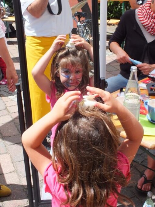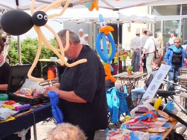 Aber und das zeigen die Bilder, ab Mittag – schönster Sonnenschein! Das Mittagsbuffet auf dem Schneiderhof – hmmmm, lecker! Viele Gäste, voller Hof, eine Tombola mit wertvollen Sachpreisen unserer Lieferanten und Kooperationspartnern, Frank – der Luftballonmodellierer, Kinderschminken, das Bastelstübchen der Näherei. Sie feiert übrigens in diesem Jahr 20. Geburtstag.