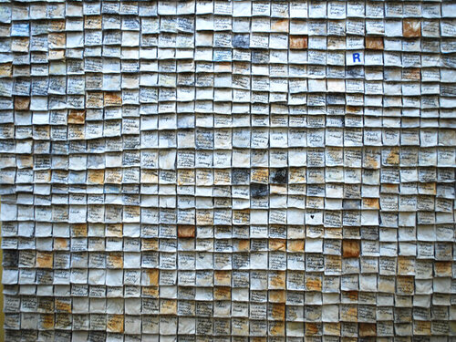 Gerade Annette Völker, die unter ihren vierzehn Kollegen im Atelier als quirliger Geist gilt, arbeitet bereits seit zwei Jahren intensiv mit Papiermosaiken. Sie ist, seit diesem Jahr zeitweise von Marlen Dolgner unterstützt, in erster Linie dafür verantwortlich, dass sich in den vergangenen Monaten die Ergebnisse in Richtung konkreter Produktlinien entwickelt haben. So gibt es Stäbchenbilder als einfache, direkte Collagen aber auch Gruppenarbeiten mit Papiermosaiken, die aufgestempelten Texten als Bildhintergrund dienen, erläutert Lutz Jürgens. Die konkrete Arbeit beinhaltet das Schneiden und Kleben von Papierschnipseln auf Hartfaserplatten und ist so gleichzeitig eine richtige handwerkliche und technische Arbeit.