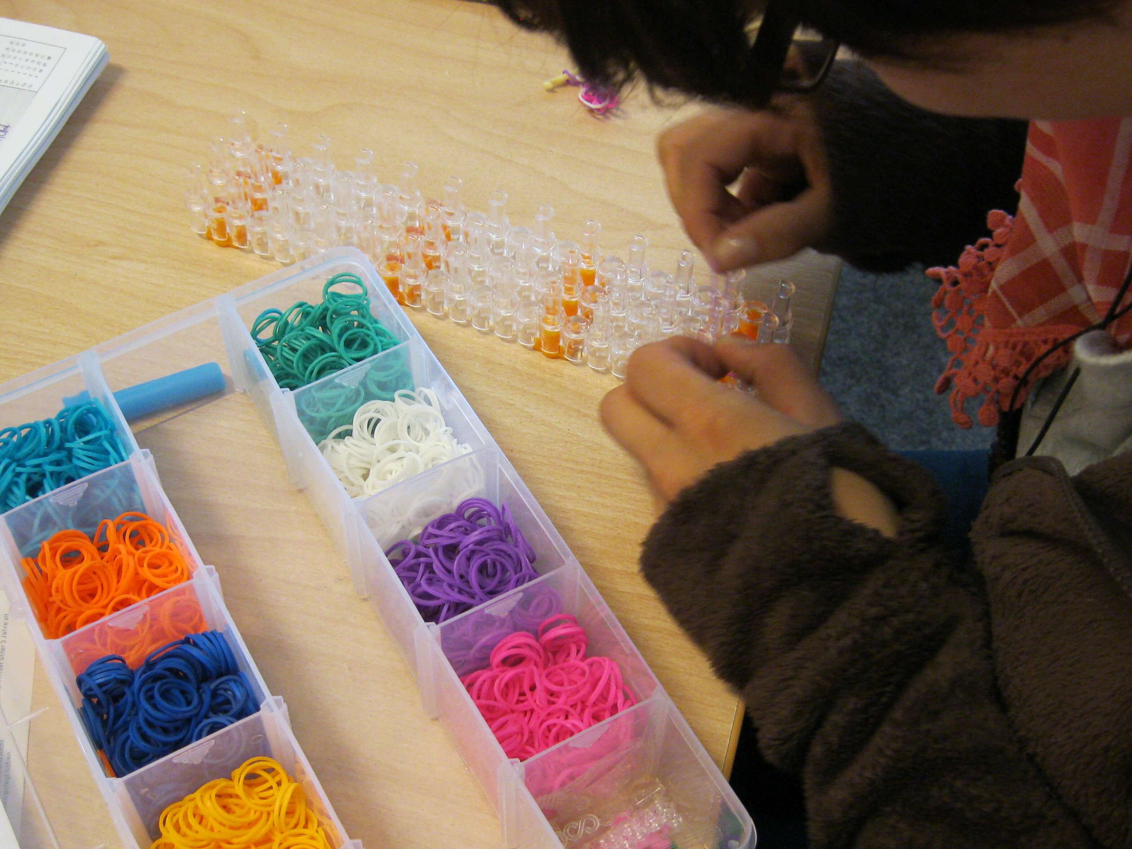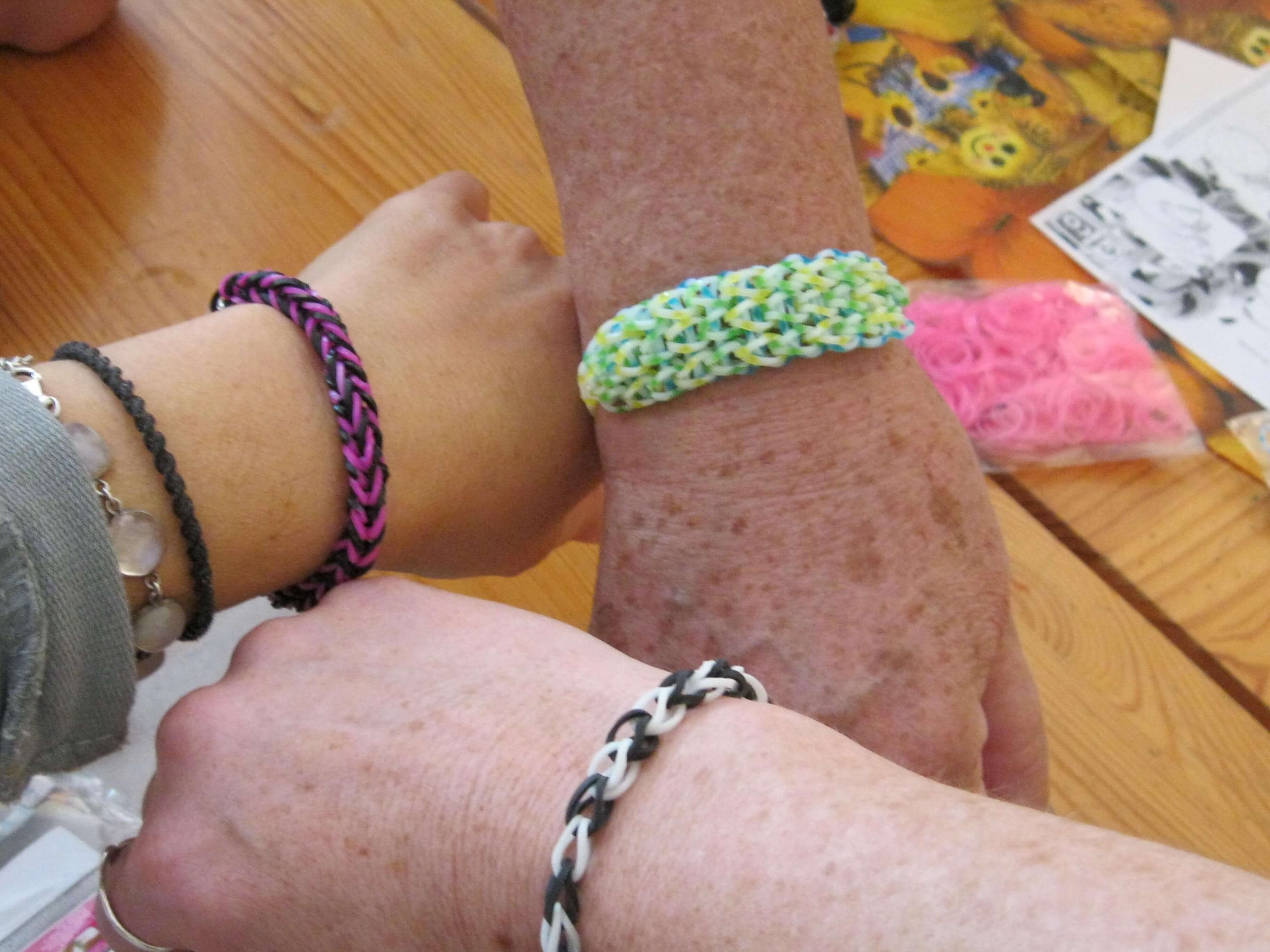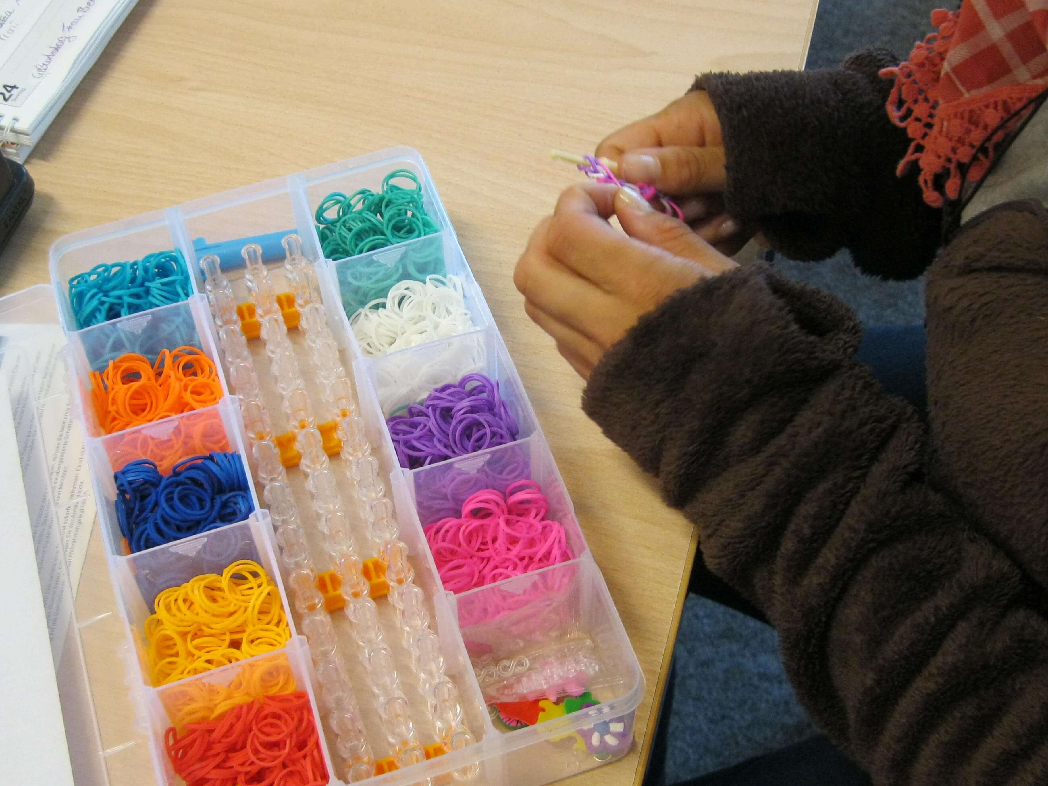 In der Ergotherapie der Tagesstätte „Sonnenseite“ für Menschen mit psychischen Störungen werden immer wieder neue Trends ausprobiert und getestet. Und so hat die Tagesstätte diesmal ein Trend erreicht, der anscheinend im Moment an kaum jemandem vorbei geht: Schmuckartikel aus Rainbow-Loom. Dabei werden kleine bunte Kunststoff-Ringe in verschiedensten Variationen und Mustern miteinander verknüpft. Konzentration und Fingerfertigkeit sind dabei von großer Bedeutung. Inzwischen gibt es kaum Besucherinnen oder Mitarbeiterinnen in der Tagesstätte die nicht täglich ein Rainbow-Loom Armband abgestimmt auf das jeweilige Outfit tragen.