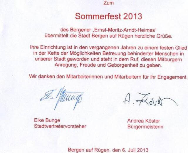 Zum Sommerfest 2013 des Bergener „Ernst- Moritz- Arndt- Heimes“ übermittelt die Stadt Bergen auf Rügen herzliche Grüße.
