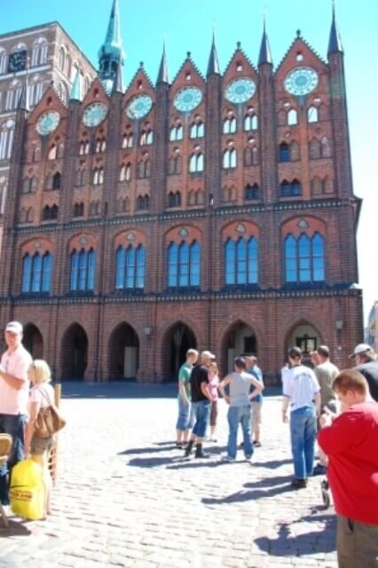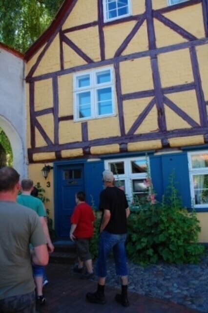 Nach dieser sehr interessanten Führung durch die Werft ging es bei bestem Wetter runter ans Wasser. Mit Blick auf die Rügenbrücke und das Ozeaneum gab es Suflaki, Gyros und Co. beim Griechen. Nachdem für das leibliche Wohl gesorgt war, erkundeten wir zum Abschluss unserer Fahrt einige sehenswerte Ecken in Stralsund. In Begleitung eines Stadtführers entdeckten wir dabei versteckte Fachwerkhäuser auf dem Hof des Johannisklosters und das ehemalige Segelschulschiff Gorch Fock 1, die übrigens erst seit 1990 wieder so heißt und davor lange Jahre unter dem Namen Towarischtsch um die Welt segelte. Wir erfuhren, dass hinter dem Rathausgiebel nur Luft ist, weil der Stadt das Geld für mehr fehlte, und fanden viele, viele weitere Spuren aus der aufregenden Vergangenheit der Stadt Stralsund.
