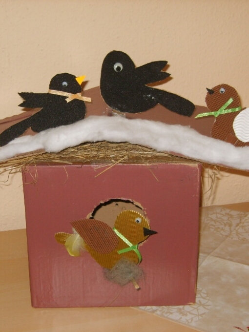 So sehen die Senioren die interessanten und schönen Seiten des Winters und gestalteten in Gemeinschaftsarbeit mit Wachsstiften und Malfarben eine Winterlandschaft und aus farbigem Karton ein Futterhäuschen.
