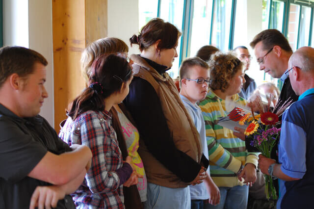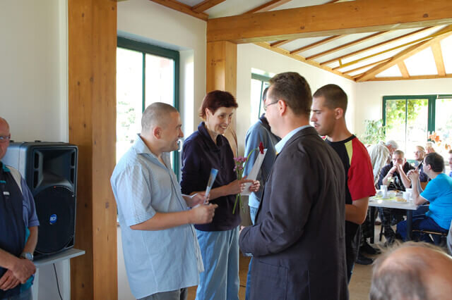 Zusammen mit weiteren Mitarbeitern und Mitarbeiterinnen, die bereits seit 20,15 oder 10 Jahren in den Werkstätten des Pommerschen Diakonievereins arbeiten, wurde den beiden am 06.09.2012 für ihre jahrelange Mitarbeit gedankt. Bei Kaffee, Kuchen und Musik überreichten der Herr Kuba (Fachbereichsleiter Industriebereiche) sowie Herr Galitz und Herr Schröder als Vertreter des Werkstattrates so insgesamt 46 Jubilaren Ehrenurkunden und Blumen. Moderiert wurde die Veranstaltung von der Fachbereichsleiterin des Integrationsfachdienstes.