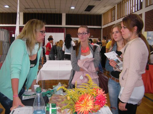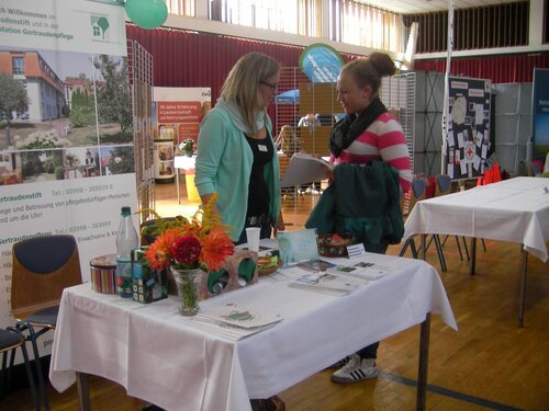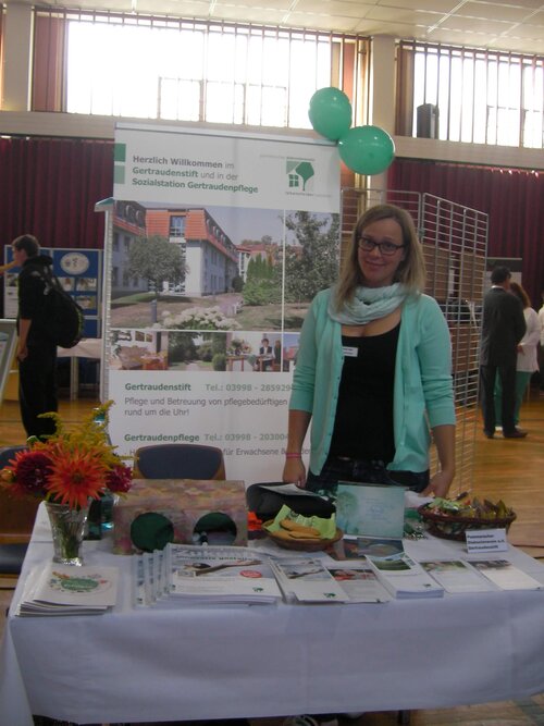 In diesem Jahr fand bereits die 15. Ausbildungsmesse „ Job fit“ in der Hansestadt Demmin statt. Vom Pommerschen Diakonieverein nahmen Mitarbeiter des Pflegeheim Gertraudenstiftes und der SST Gertraudenpflege an der Veranstaltung teil und warben für den Beruf des Altenpflegers, dem Dualen Bachelor Studiengang, dem FSJ und Bundesfreiwilligendienst. Rede und Antwort standen den Interessierten neben der PDL und RGL, Frau Tobe und Frau Baumann. Frau Tobe, die ihre 3- jährige Ausbildung zur Altenpflegerin im September 2013 im Gertraudenstift beendet hat, arbeitet seit September 2013 als Pflegefachkraft in der SST Gertraudenpflege. Frau Baumann befindet sich seit 2011 im Dualen Studiengang. Unser Stand wurde an diesem Tag gut besucht, so dass wir hoffen, auch im nächsten Jahr wieder geeignete Bewerber für eine Ausbildung oder ein soziales Jahr in unserem Verein zu finden.