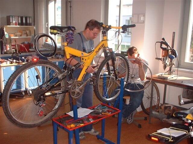 Sie hatten einen Fahrrad-Montagebock mit. Kleinreparaturen wie Kette und Decke wechseln, Klingel und Speichenreflektoren ersetzen wurden sofort vor Ort wurden vorgenommen.