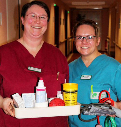 Bereits im letzten Jahr war dieses Projekt sehr positiv aufgenommen und durchgeführt worden. Nun folgte der nächste Durchgang. Mit dabei waren Schüler:innen aus dem ersten und dritten Ausbildungsdrittel der generalistischen Pflegeausbildung, die sich jeweils in Zweier- und Dreiergruppen zusammenfanden. Die gemischten Teams waren während der drei Tage gemeinsam (im Frühdienst) für die Versorgung und den Pflegeprozess der Bewohner:innen des Pflegeheims in Züssow verantwortlich. Unter den wachsamen Augen von Kathrin Boldt und Christoph Küthe planten sie die Pflegeinterventionen, führten diese unter Anleitung durch und dokumentierten im Anschluss die Ergebnisse und Auffälligkeiten. Die gemachten Erfahrungen und Beobachtungen wurden abschließend an die Pflegedienstleitung der Einrichtung weitergegeben.
