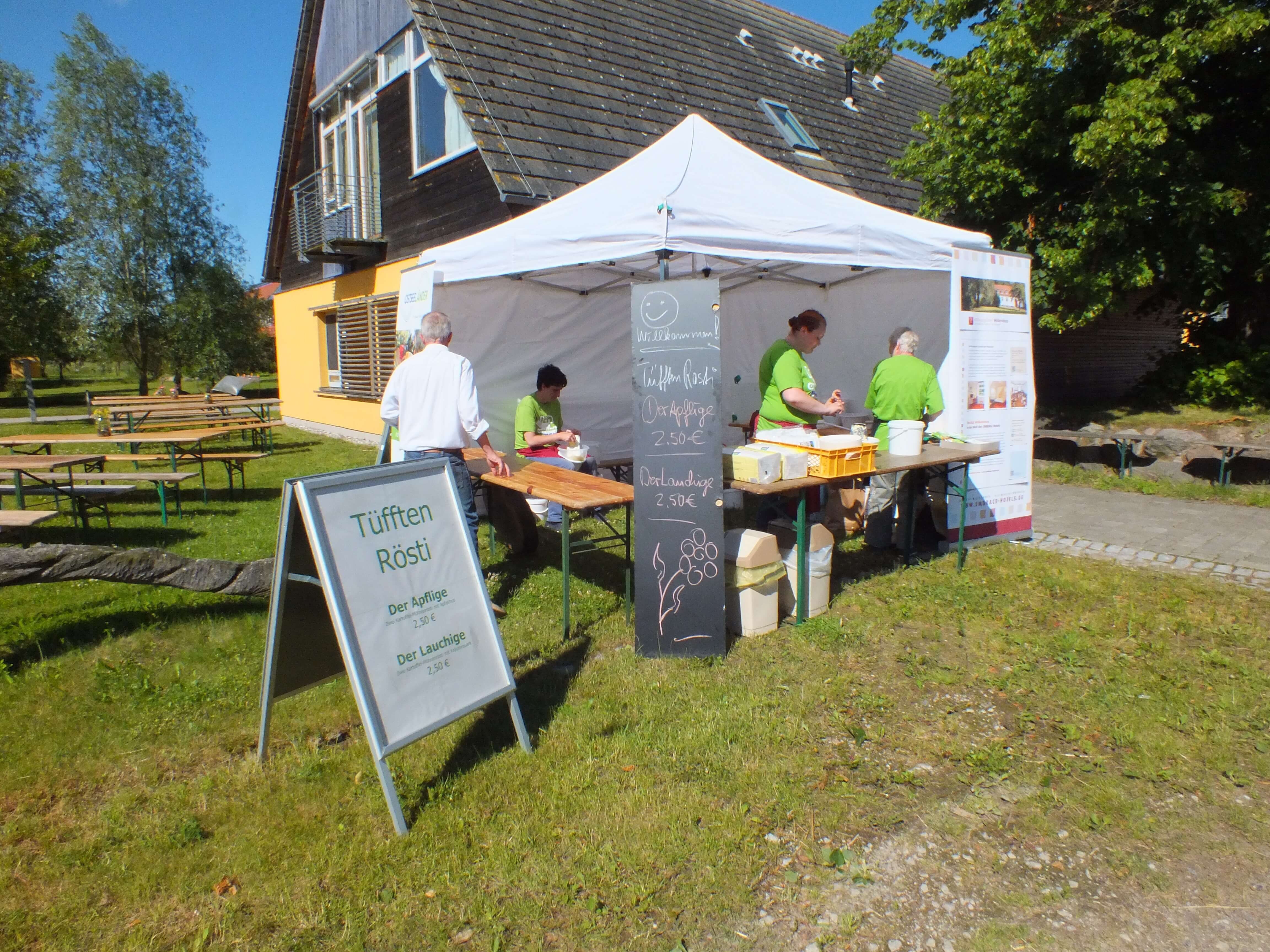 Mit selbstgemachten Tüfften – Rösti, als apflige oder lauchige Variante, waren wir die kulinarische Attraktivität. Frau Behnke, Herr Kulack und Frau Segert aus dem hauswirtschaftlichen Arbeitsbereich in Züssow haben zum ersten Mal unser neues Marktangebot ausprobiert.