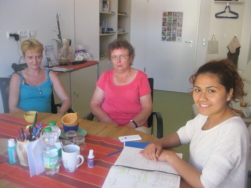 Zunächst lernten sich die Studenten und Klienten kennen. Die Sprachbarriere stellte überraschenderweise kein Hindernis dar. Frau K., Besucherin der Tagesstätte, fungierte als Dolmetscherin, da sie über hervorragende Englischkenntnisse verfügt. Durga aus Nepal interviewte Klienten und Mitarbeiterinnen der Sonnenseite sowie eine Bewohnerin des Hauses. Aus den Eindrücken, die sie durch diese inspirierenden Gespräche gewann, entstand ein Gedicht. Ragnhild Folling Volden aus Norwegen verbrachte einen Vormittag mit einer Klientin der Tagesstätte und ließ ihre Erfahrungen in ihr Projekt mit einfließen. Eric Roger, ebenfalls aus Norwegen, nutze die verschiedenen Geräusche und Klänge rund um den Markt und die Kirche für seine Arbeit.