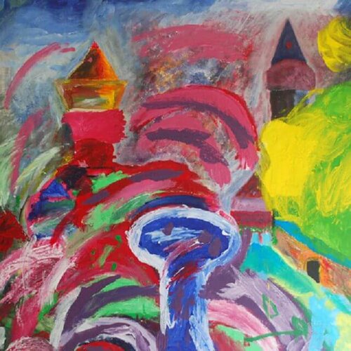 Zu sehen sind 7 großformatige, farbenfrohe Bildquadrate unterschiedlicher Künstler und zwei Infotafeln zum Atelier.