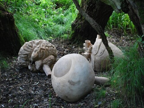 Blaumeier-Atelier Bremen, 3 Künstler – 3 Skulpturen aus Pappelholz: Uwe Kreutzkamp „Vom Fischer und seiner Frau“. Helmut Mahlstedt ist seit 20 Jahren bei den Blaumeiern „Waldgeist“. Er arbeitet sehr viel mit dem Archäologischen Institut der Hansestadt Bremen zusammen. Boleslaw Jankowski „Ein Drachen“.