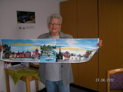 Die Malerin Bärbel Franck überreichte der Leiterin des Pflegeheim Gertraudenstiftes, Birgitt Küthe, am 27.04.2012 ein Bild mit Sehenswürdigkeiten der Hansestadt Demmin.