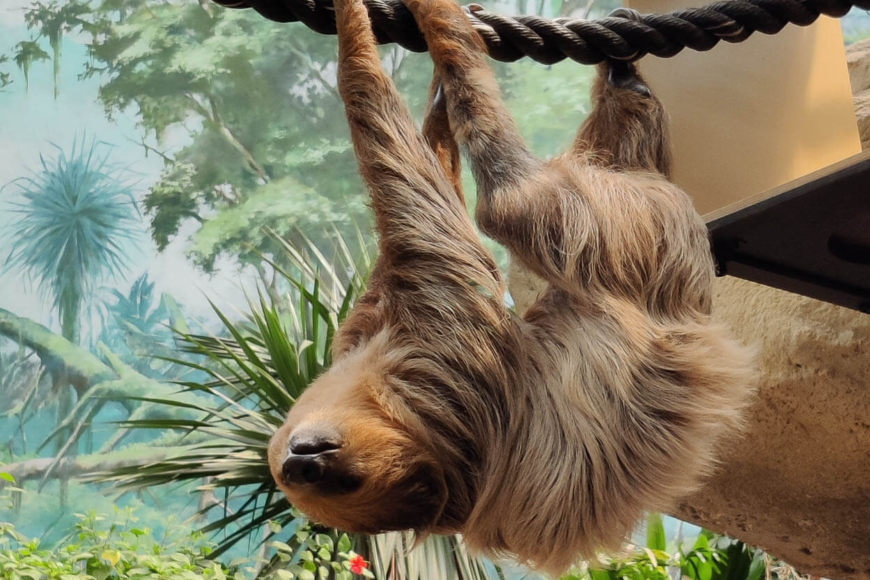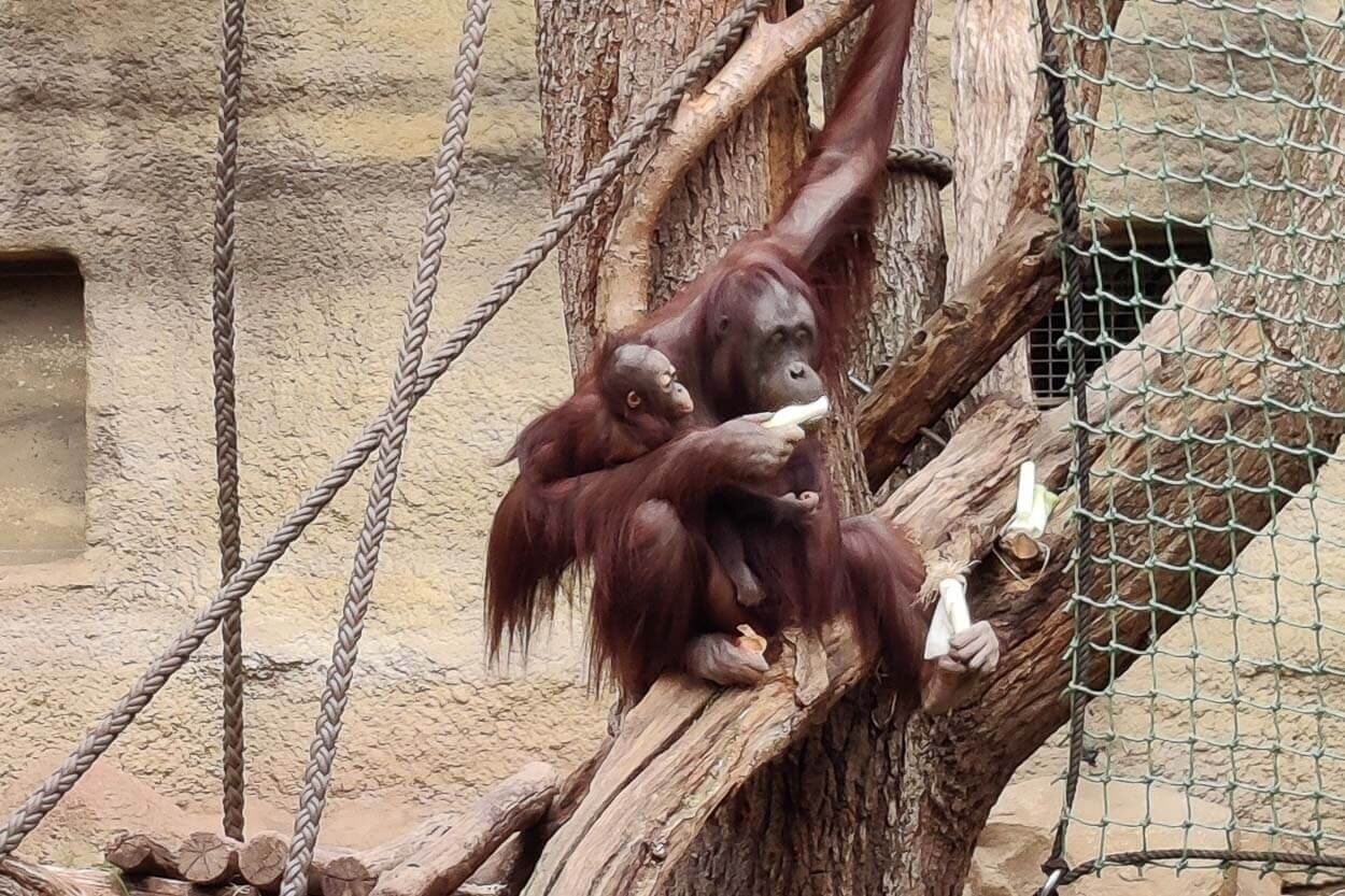 Wunderbar waren die Tiere in der Tropenhalle zu beobachten, von ganz kleinen Fröschen über Leguane bis zu Orang-Utans mit ihren Babys. Eine Tierpflegerin erzählte uns von einem blinden Gorillamännchen, vom Faultier Jens, der hoch oben unter dem Dach schlief und zeigte uns die Faultierdame Radgar aus Tschechien.