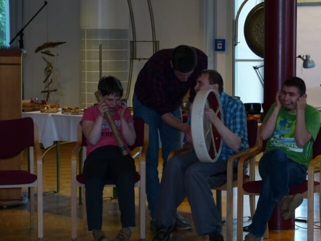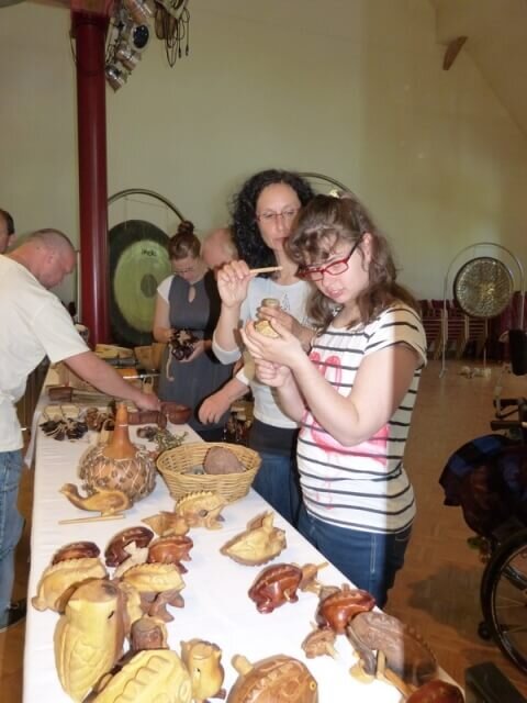 Die Fördergruppen der Greifenwerkstatt aus Greifswald und Züssow sind gemeinsam zur Bildungsfahrt ins Klanghaus nach Klein Jasedow gefahren. Nach einer freudigen Begrüßung, die Kollegen und Teilnehmer aus der anderen Gruppe wiederzusehen, folgte eine klangvolle Willkommensrunde. Gemeinsam probierten wir die verschiedensten Klanginstrumente in klein und riesengroß aus und sammelten beeindruckende Körpererfahrungen dabei. Es entstand eine interaktive Musikrunde.