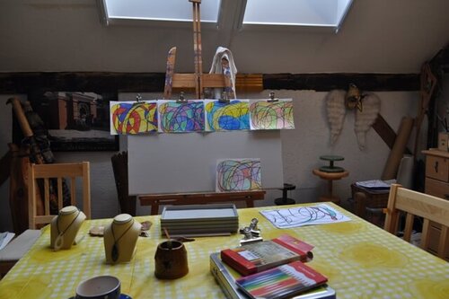 Am 14. Februar besuchte das Team vom Ostseeländer Hofcafé den Dipl. Kunsttherapeuten Ben Silg in seinem Studio. Wir übten meditatives malen und versuchten danach über unsere kleinen Kunstwerke frei zu reden. Es war schon erstaunlich, das jede Person andere Farben und Formen benutzt hat und somit auch jedes Bild anders auf jeden einzelnen wirkte. Nach Beendigung des Malens übten wir uns im Speckstein bearbeiten. Jeder konnte für sich ein kleines Schmuckstück oder einen persönlichen Glücksstein herstellen. Die Arbeit wirkte sehr beruhigend auf uns und förderte die Konzentration jedes einzelnen. Nach Beendigung der Arbeit durften wir einen Blick in die Heiligtümer des Künstlers werfen. Wir schauten uns Skulpturen und Aquarelle an und waren sehr beeindruckt über die Arbeiten. Herr Silg ist ein treuer Kunde des Ostseeländers. Noch bis zum 30.03.11 sind seine Collagen im Amt Züssow zu betrachten und auch käuflich zu erwerben. Für uns war der Tag sehr schön und hinterließ viele positive Eindrücke. Vielleicht stellen wir auch mal eine Collage her - Inspiration haben wir ja jetzt.