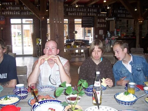Wir, die Tischlerei der Greifenwerkstatt, erfuhren bei einer kleinen Führung so Einiges über „die Erdbeere“ und über den Erlebnishof. Mandy: „So viel Erdbeeren kann man an einem Tag pflücken?“ (1 Mann = 2 Zentner). Die Gruppe verstand sich prima und hat sich prächtig unterhalten. Frank: „Einen fliegenden Kuhstall gibt es ja gar nicht!“ Als er dann neben der Traktorfahrt damit flog und einen ganz kribbligen Bauch bekam, da hat er gewusst, dass es den fliegenden Kuhstall gibt. Tom: „ Das Essen ist ja herrlich, Frühstück super und das Mittag ist ja kaum zu schaffen.“ Das gleiche hat auch Kay gemeint. Porzellanmalerei, Glasgestaltung, Bonbonherstellung und der kleine Tierpark, alles super Sachen die zum guten Gelingen der Bildungsfahrt beigetragen haben. Einheitliche Meinung: „Immer wieder. Gut organisiert. Viel gelernt und gesehen! Hat wirklich Spaß gemacht.“