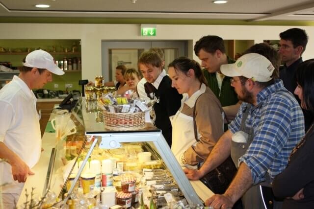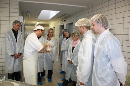 Danach zeigten Herr Arndt (Käser) und einige Mitarbeiter des Ostseeländers den Teilnehmern die Produktionsräume der Käserei und Manufaktur. Die Köche durften hier an der spannenden Entstehung des „leckeren“ Ostseeländer Käses teilhaben. Besonders begeistert zeigten sich die angehenden Bioköche bei der nachfolgenden Verkostung der verschiedensten Produkte. Der einzigartige Geschmack und die hervorragende Qualität wurden vielfach gelobt.