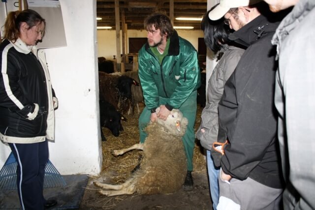 Herr Lüdemann (Landwirt) führte die Besucher anschließend über den Ostseeländer Bauernhof, zeigte Ihnen den Schafstall und die Melkanlage.