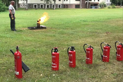 Hagen Braun unterwies eindringlich und eindrücklich zu allgemeinen, rechtlichen und physikalischen-chemischen Grundlagen, zum vorbeugenden und abwehrenden Brandschutz, zur Personenrettung und ermutigte vor allem durch praktische Übrigen mit den Feuerlöschern, Hemmungen und Unsicherheiten abzubauen.