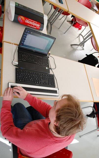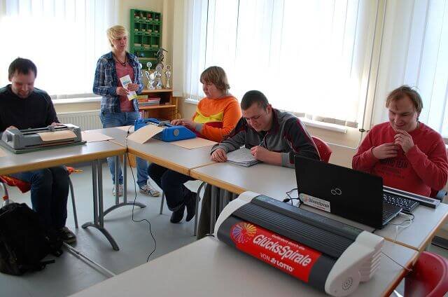 Dank der Glücksspirale konnten wir endlich die vollumfänglich notwendige technische Ausstattung realisieren– gängige Office-Anwendungen können nun selbständig bedient, und Texte erstellt werden. Diese können dann mit dem bereitgestellten Braille-Drucker in Blindenschrift ausgegeben werden. Ein Screenreader mit Braillezeile ermöglicht einen barrierefreien Zugang zum Internet und die automatische Sprachausgabe ermöglicht das „Lesen“ aller über den Computer zugänglichen Texte. Eigene Aufzeichnungen erfolgen an den Bildungstagen über eine elektronische Schreibmaschine - mit diesem Berufsbildungsplatz haben wir eine Grundlage für blinde Teilnehmer geschaffen, ihre Berufliche Bildung gleichberechtig mit sehenden Teilnehmern zu absolvieren, mit größtmöglicher Vielfalt, Selbständigkeit und vor allem mit viel Spaß am Lernen.