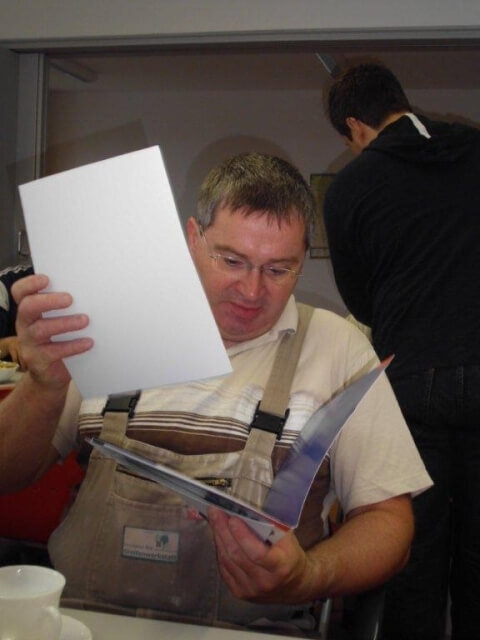 Herr Saß ist ebenfalls Absolvent der Beruflichen Bildung. Im Kreise seiner Arbeitsgruppe – den Kollegen und Kolleginnen des Kopier- und Grafikstudios – nahm er seine Glückwünsche samt Urkunde und Zertifikat entgegen. Er ist glücklich, (s)einen Arbeitsplatz gefunden zu haben.