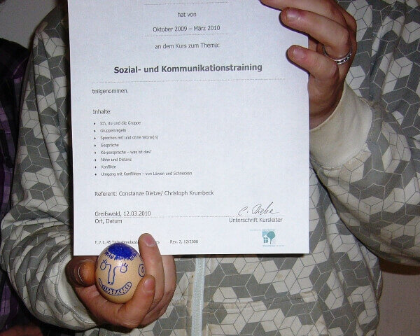 Um diesen Auftrag zu erfüllen, war es wichtig Absprachen zu treffen, miteinander zu kommunizieren und Regeln für das Gelingen aufzustellen. Dies war eine gute Möglichkeit, das im Seminar Erlernte und Geübte auch im Alltag auszuprobieren und anzuwenden. Die Teilnehmer meisterten diese Aufgabe mit Bravour und übergaben das Ei unbeschadet am Freitagmorgen den Kursleitern, die ihrerseits auch noch 3 Stunden die Unversehrtheit gewährleisten mussten. Jeder Einzelne und alle zusammen gewannen erstaunliche Eindrücke und Erkenntnisse über sich selbst, Gruppenregeln, Teamarbeit, Kommunikation, Nähe und Distanz und den Umgang mit Konflikten.