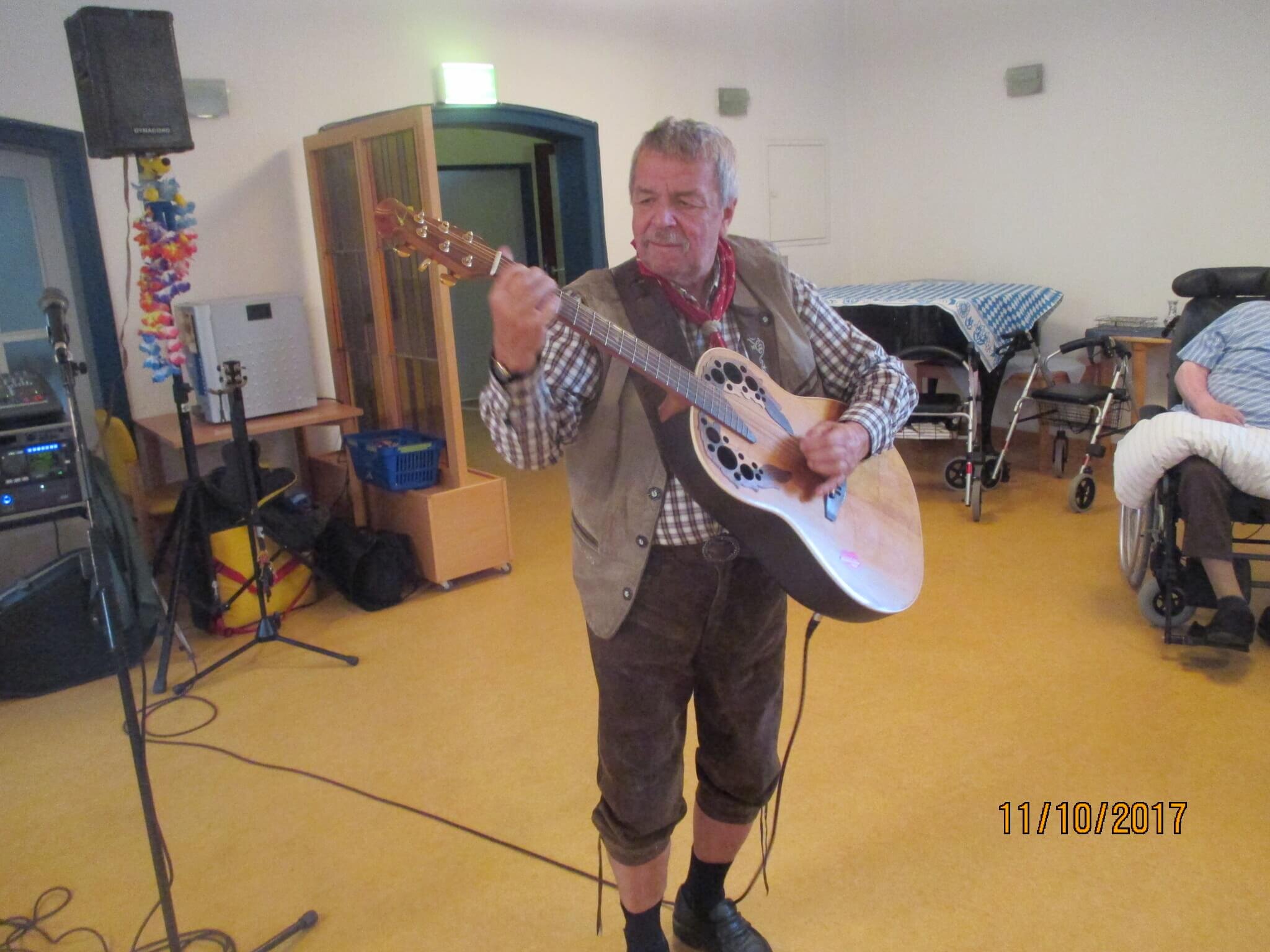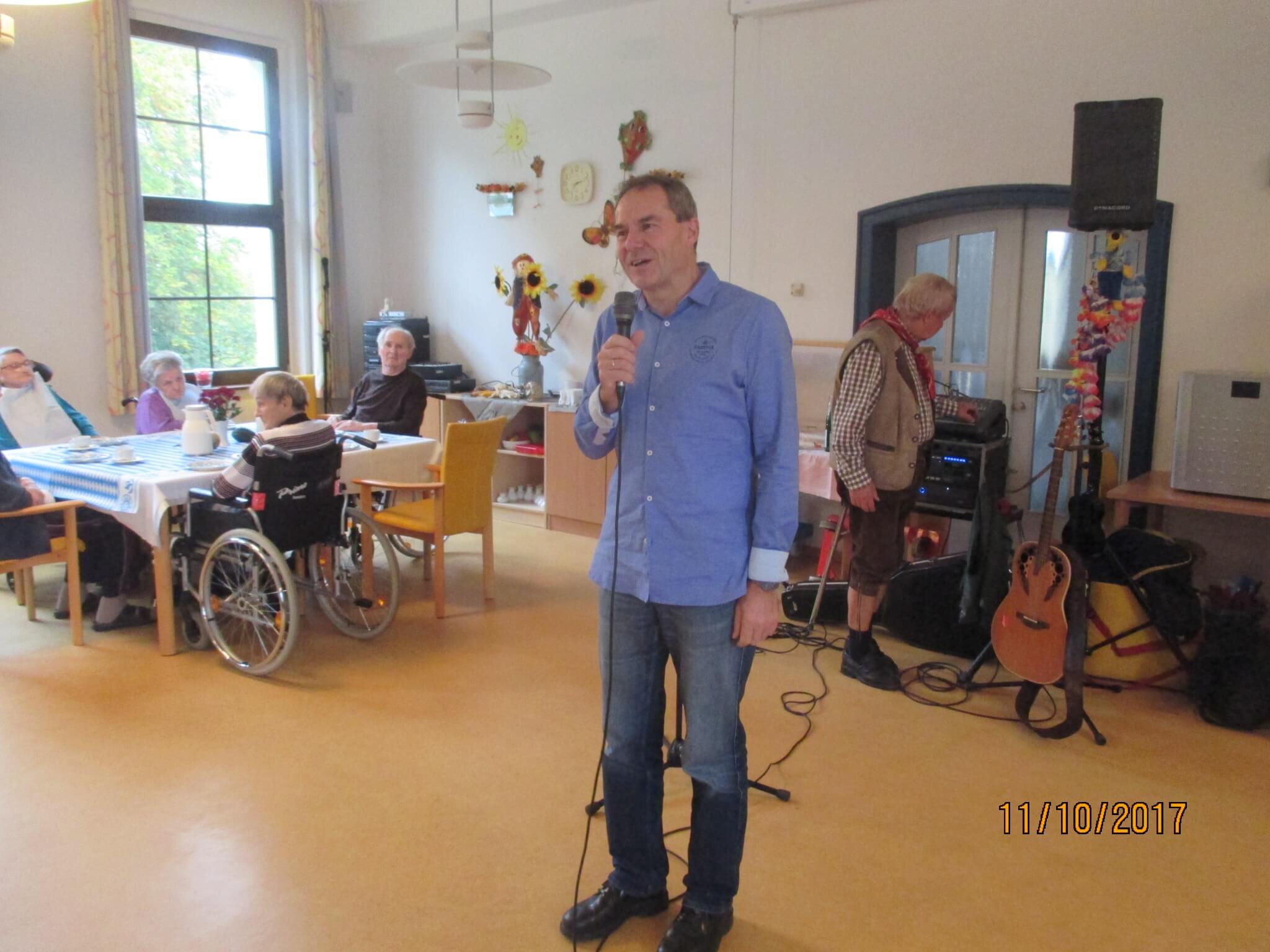 Herbeigereist war der Entertainer Herr Kademann aus Sachsen der mit seinem Unternehmen Saitensprung in Windeseile den Sangesnerv der Zuschauerrinnen und Zuschauer traf und bei einem kurzweiligen angenehmen Nachmittagsprogramm im Saal des Hauses das Oktoberfest in allen seinen Facetten im geselligen Miteinander so richtig aufleben ließ.