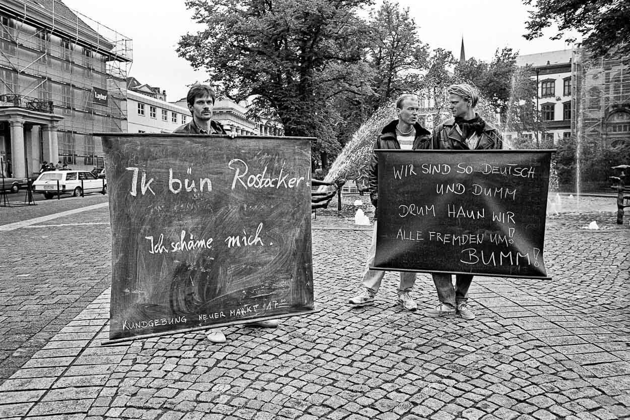 Die Schwarzweißaufnahme eines Mannes, bekleidet mit einem Fußballtrikot und einer Jogginghose, der den Arm zum „Hitlergruß“ hebt, ging um die Welt. Es wurde Symbol für die viertägigen Ausschreitungen, für die Ereignisse in Rostock. Martin Langer fertigte dieses Foto an, als er im Auftrag des Nachrichtenmagazins „Der Spiegel“ drei Tage lang die Übergriffe dokumentierte. Er dokumentierte jedoch auch jene Rostocker:innen, die sich klar gegen diesen Hass positionierten.