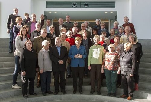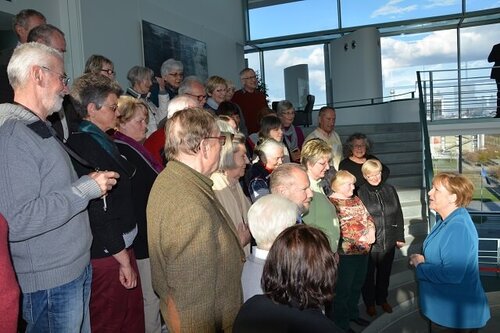 Am Nachmittag, pünktlich zu Beginn der Führung durchs Kanzleramt, kam dann die gute Nachricht: Angela Merkel wird Berlin rechtzeitig erreichen. Auch wenn der ganze Tag im Regierungsviertel ein tolles Erlebnis war – ein Gruppenfoto auf den berühmten Stufen im Kanzleramt zusammen mit der Bundeskanzlerin ist natürlich ein besonderes Highlight. Zuvor gab es jedoch einen kurzweiligen Rundgang durch das beeindruckende Gebäude. Ob Architektur, Kunst oder Politik: Man erfuhr viel Neues zwischen Pressewand, Kanzlergalerie und Kabinettsaal. Als die Gruppe in der Abendsonne auf der Terrasse stand und den Ausblick in Richtung Bundestag genoss, war auf einmal ein Hubschrauber zu hören. Wie inszeniert flog der Helikopter der Luftwaffe dicht über das Gebäude, so dass man der Kanzlerin fast zuwinken wollte. Kurz darauf kam sie ganz natürlich und gelöst zum Fototermin – von kleinen und großen Gipfeln, Staatsbesuchen und Weltpolitik, Sorgen und Problemen war ihr nichts anzumerken. Nach dem Foto nahm sie sich kurz Zeit für ein Gespräch, bei dem sie noch einmal ihre Anerkennung für das tolle Engagement der Ehrenamtlichen zum Ausdruck brachte. Während Angela Merkel im Anschluss zurück in ihr Büro ging, hatte die Besuchsgruppe aus Greifswald Feierabend und fuhr mit vielen schönen Eindrücken zurück in den Norden.