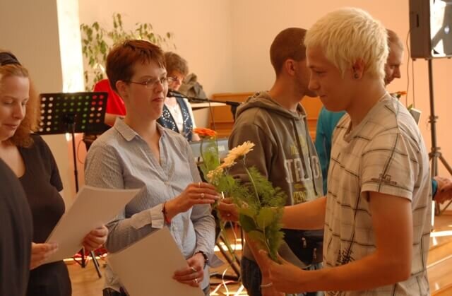 Die Stimmung im Wichernsaal war geprägt von Spannung, Aufregung und großer Freude. Bei Kaffee, Kuchen und Musik der Band Seeside ergriffen eine Vielzahl von Fachkräften das Wort und ehrten mit kleinen Anekdoten aus dem Arbeitsalltag und ebenso emotionalen Worten die Mitarbeiter, die sie nun schon 10, 15 oder 20 Jahre begleiten. Auch innerhalb der Fördergruppe gab es drei Jubilare, die mit viel Lachen und Herzlichkeit geehrt wurden. Für die Teilnehmer des Eingangsverfahrens, die ihre Bildung erst in den vergangenen Wochen in der Greifenwerkstatt aufgenommen haben, fand in diesem Rahmen die feierliche Begrüßung statt. Unter den stolzen Blicken vieler Angehöriger wurden sie durch ihre Bildungsbegleiterin vorgestellt und Willkommen geheißen.