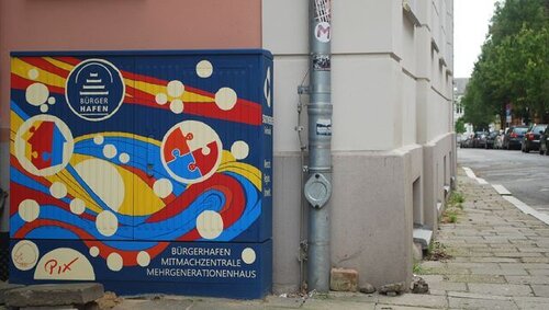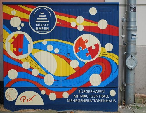 In den vergangenen Tagen durfte das Atelier PIX im Auftrag des Bürgerhafens den alten Stromverteiler direkt an der Alten Sternwarte in Greifswald gestalten. Der frische Anstrich beherbergt nun das Logo des Bürgerhafens sowie die beiden Logos seiner Initiativen MitMachZentrale und Mehrgenerationenhaus. Eingebettet in den Kontext der Alten Sternwarte, schweben die Logos in einer Art Milchstraße und sollen auf das bürgerschaftliche Engagement der Region aufmerksam machen.