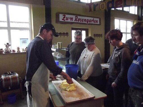 Dort angekommen haben wir bei einem gemeinsamen Frühstück die hofeigenen Geflügelprodukte verkostet. Anschließend gab es eine spannende und interessante Hofführung durch Bauer Kliewe bei der reichlich Fragen gestellt wurden. Nach dem Mittagessen fuhren wir mit dem Bus weiter zur „Haflingerzucht Ummanz“. Nach kurzer Vorstellung unserer Kutscher startete auch schon die einstündige Kremserfahrt durch die Gemeinde Ummanz, bei der es viel zu sehen und zu lachen gab. Zum Abschluss ging es dann zu „Bauer Lange“, schließlich wollten wir ja noch wissen wie man selber Butter macht. Wir wurden durch Bauer Lange herzlich empfangen und konnten nach ausführlicher Einweisung gleich selber Hand anlegen. Jeder der wollte durfte mal am Butterfass drehen, mit Erfolg - einige Pfund Butter sowie Buttermilch waren das Ergebnis. Dieses durften wir dann zusammen mit zwei verschiedenen Kartoffelsorten (die er selber anbaut) und hausgemachtem Zwiebelbrot verkosten. Dieser anstrengende, aber schöne Tag war für alle bereichernd. Wir konnten vielfältige Eindrücke, Ideen und Erinnerungen mitnehmen. Diese helfen uns in der täglichen Arbeit weiter und haben die Gruppenzusammengehörigkeit gestärkt.