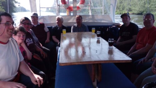 Um 8:30 Uhr nahmen 27 aufgeregte Männer und Frauen Platz im bestellten Reisebus, der uns nach Jarmen fuhr. An der dortigen Anlegestelle wartete schon ein Fahrgastschiff auf uns. Allerdings war es für Manchen eine Mutprobe, um an Bord zu kommen: Der Steg zwischen Land und Schiff musste einen ziemlichen Höhenunterschied ausgleichen, sodass er mit einem Ende in der Luft hing. Ob gut zu Fuß oder nicht- mit Hilfestellung der Schiffsbesatzung gelang es schließlich allen Mitarbeitern/innen und zwei Rollatoren, die „Hamburg“ zu besteigen und einen guten Platz zu finden.