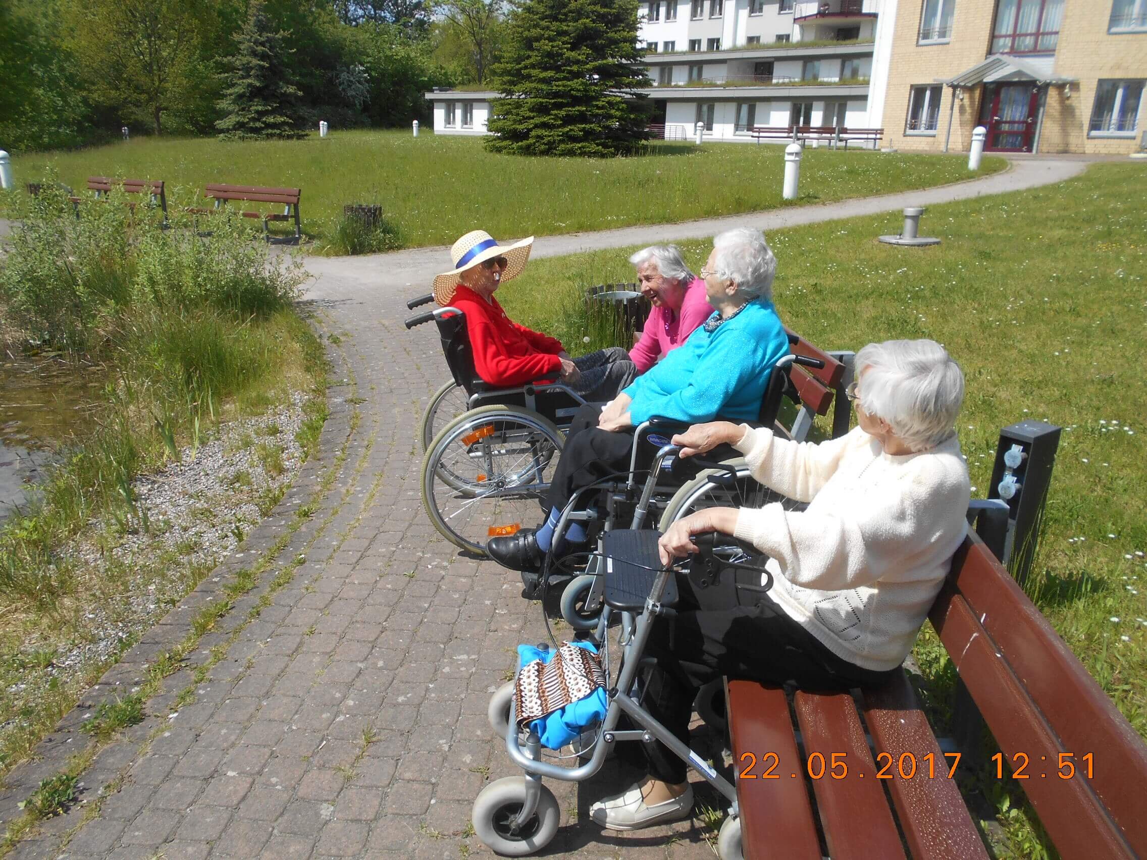 Der Aufenthalt an der freien Luft, ob auf Balkonen oder an den Bänken dicht am Goldfischteich, in der Erkundung der Parkanlagen rings um das Heim, überall gibt es Möglichkeiten sich im geselligen Miteinander angenehmen Erlebnissen hinzugeben.