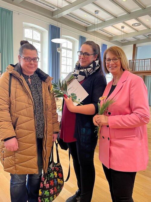 Eine Mitarbeiterin ist, wenn man auf die Anzahl der Berufsjahre blickt, ein strahlendes Highlight, denn sie schreibt ihre berufliche Geschichte seit 30 Jahren in der Greifenwerkstatt und ist voller Stolz und Freude, als sie auf der Bühne geehrt und mit Dank, Blumen und einem symbolischen Licht beschenkt wird. Und wie wunderbar ist es, wenn auch schon die „Neuen“ voller Freude und Selbstbewusstsein zusammenstehen, um gemeinsam ihre eigenen Wege in die gewünschten Arbeitsfelder zu gehen.