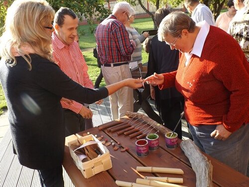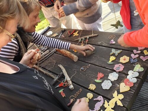 Das schöne Wetter lud zum Verweilen im Freien ein und unser Kreativangebot fand viele Interessenten und insbesondere einige Eltern halfen tatkräftig beim Herstellen von Windspielen mit.
