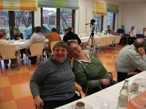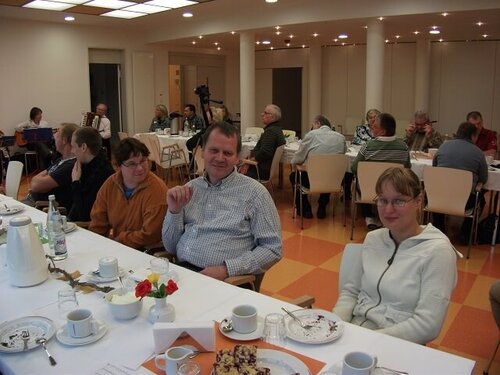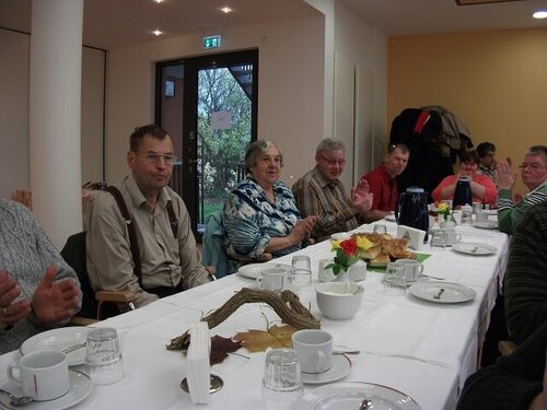 Auch in diesem Jahr luden wir, die Mitarbeiter und Bewohner der WG 3 / Aussenwohngruppe, zum Angehörigentag ein. Schon Wochen vorher wurden Einladungskarten gestaltet und der Text zu einer bekannten Melodie geschrieben. Fast täglich sangen wir dann unser Lied, welches etwas über Freude und Aktivitäten im Bewohnerleben aussagt. Am 29.10.11 war es dann soweit, im großen Saal des „Katharinenstiftes“ wurde die Kaffeetafel festlich gedeckt und in Vorfreude erwarteten wir unsere Gäste. Zur musikalischen Umrahmung luden wir die Band aus dem Mehrgenerationenhaus BÜRGERHAFEN ein, die uns dann mit 6 Bandmitgliedern besuchten. Nach der Begrüßung aller Anwesenden kam dann unser großer gesanglicher Auftritt mit musikalischer Begleitung der Band.
