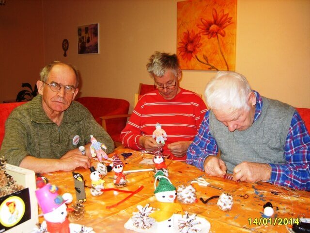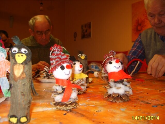 . . . haben die Bewohner der Einrichtung mit ihren Bastelarbeiten in diesem Monat. Sie fertigten aus Tannenzapfen, Styropor und Filz lustige Schneemänner. Aus Papier entstanden Skiläufer, die sie farblich gestalteten und ausgeschnitten haben. Eifrig und mit viel Freude wurden die Ergebnisse präsentiert und dann im Wohnbereich verteilt bzw. zum Verschenken an Freunde und Verwandte mitgenommen. Und tatsächlich – passend zu dieser Veranstaltung – begann es ein wenig zu schneien.