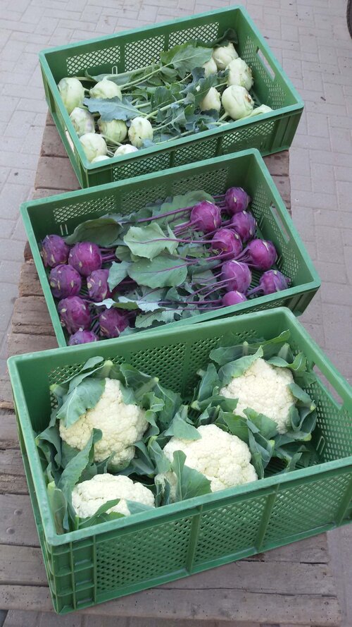 Sehr gute Ernteergebnisse erzielten wir bereits beim Kohlrabi (knapp 1000 Stück in einer Woche) und Blumenkohl im Gewächshaus. Angesichts der Temperaturen eine Herausforderung für alle Beteiligten! Anbei sind Bilder von kurz nach der Pflanzung im März und vom tollen Ernteergebnis zu sehen.