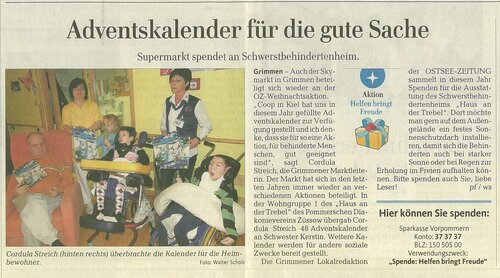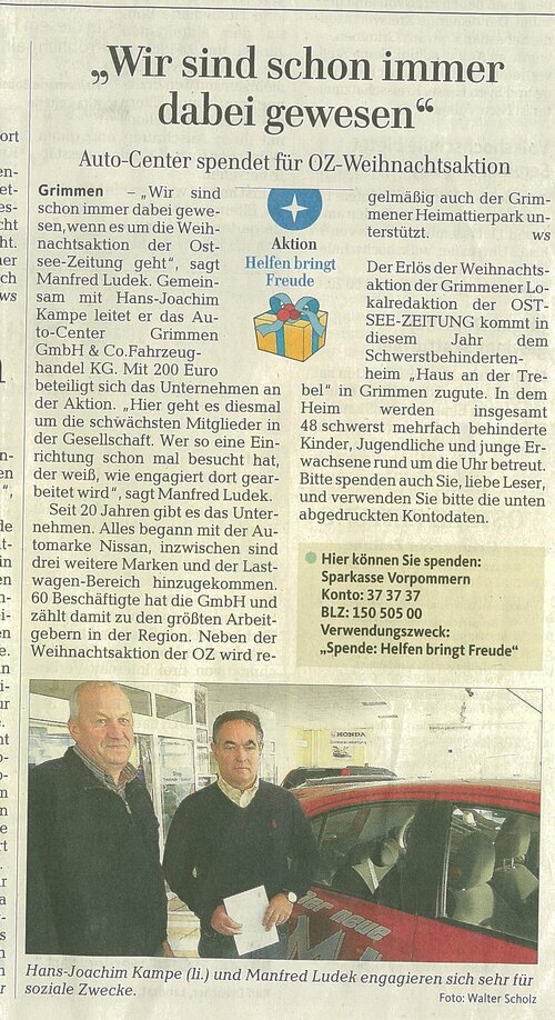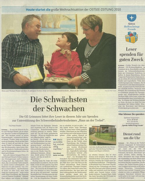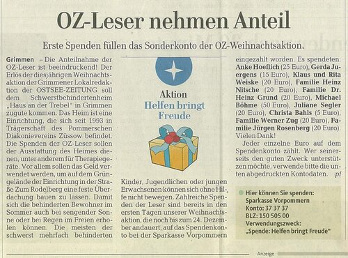 Die Weihnachtsspendenaktion der OZ Grimmen, " Helfen bringt Freude", ist in diesem Jahr für das Haus an der Trebel bestimmt.