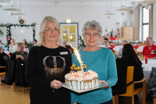 Ein weiteres Highlight an diesem Nachmittag war die Verabschiedung einer geschätzten Mitarbeiterin. Anette Stöwer war 31 Jahre lang Mitarbeiterin im Nikolaiheim und geht nun am 01. Dezember in den wohlverdienten Ruhestand. Um dies gebührend zu feiern, überreichte ihr eine Mitarbeiterin stellvertretend für das ganze Team einen Präsentkorb mit vielen kleinen und großen Überraschungen. Auch eine Torte, die ihre Kollegin Melanie Gesche vorab liebevoll gebacken und dekoriert hatte, wurde übergeben.