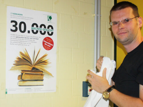 Dann wurde das neue EINGEBUNDEN-Plakat enthüllt, welches demnächst an vielen Standorten des Pommerschen Diakonieverein e.V. auf unser Arbeitsangebot aufmerksam machen wird und zu Buchspenden animieren soll.