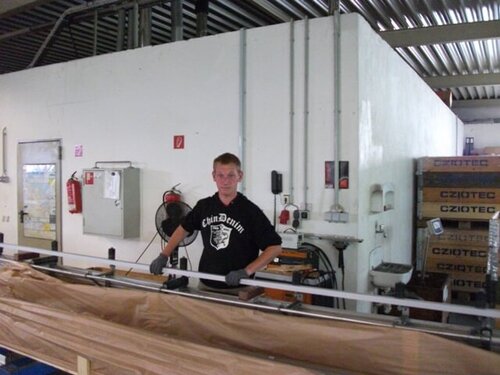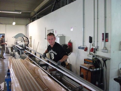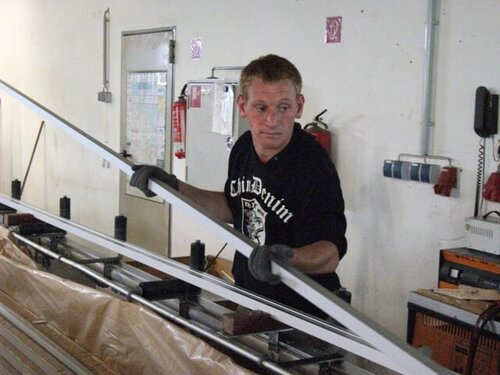 Zu den täglichen Aufgaben von Herrn Haack gehören das Verpacken von Befestigungselementen für Solarmodule, das Einschweißen von Paletten sowie die Bestückung der Zuschnittsägen mit Langmaterial.
